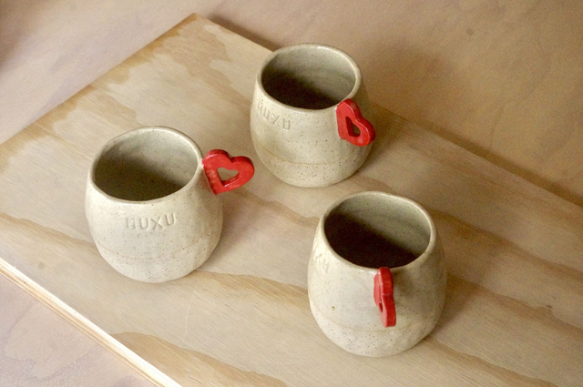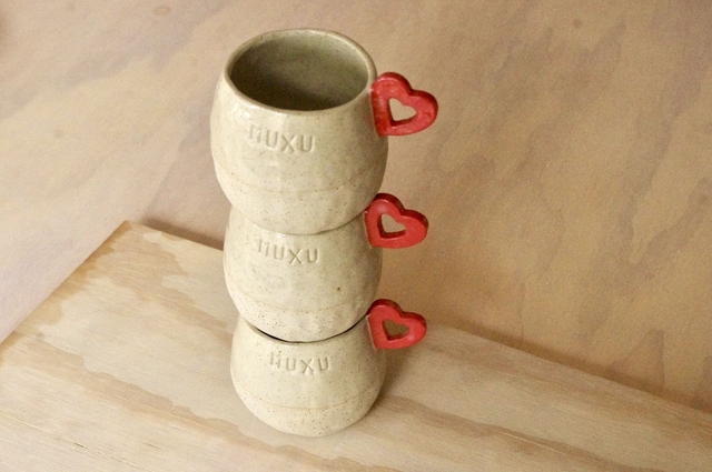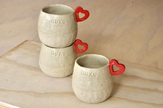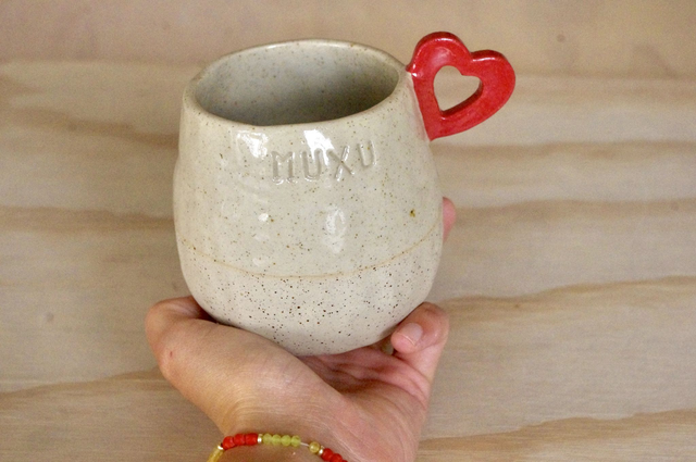 Fabrication artisanale à Bayonne. Modelage en grès pyrité, anse-coeur rouge, émail transparent.