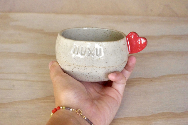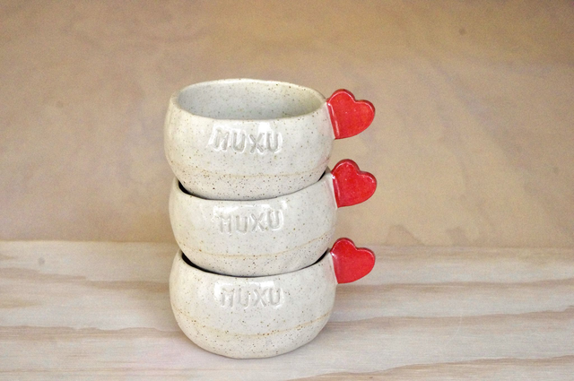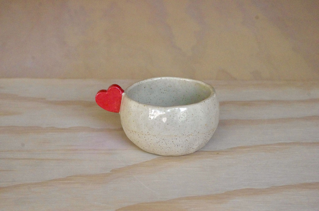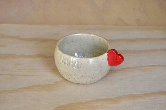 Fabrication artisanale à Bayonne. Modelage en grès pyrité, anse-coeur rouge, émail transparent.